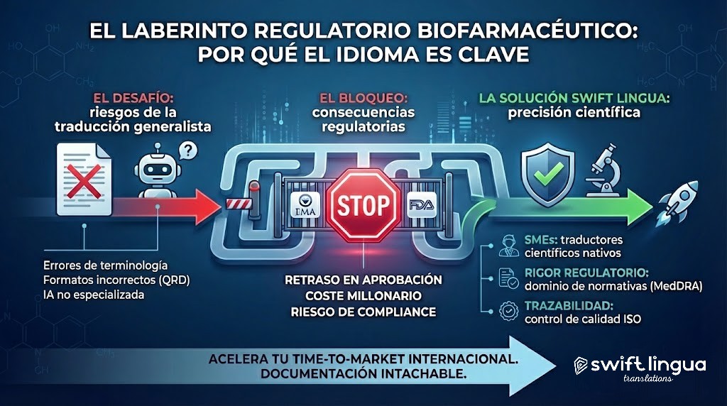 En el sector biofarmacéutico y de Life Sciences, un error de traducción no es una simple «errata». Es un bloqueo regulatorio que retrasa meses tu salida al mercado, dispara los costes y pone en riesgo el cumplimiento normativo (compliance).